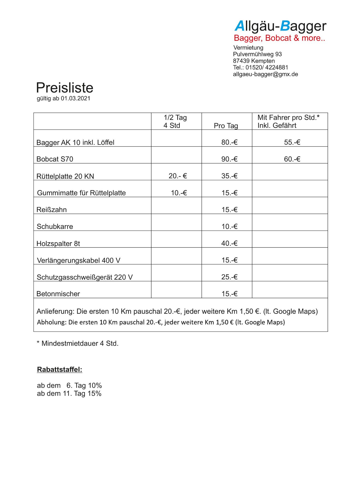 Sie möchten einen Bagger/ Bobcat oder andere Werkzeuge und Maschinen im Allgäu mieten?